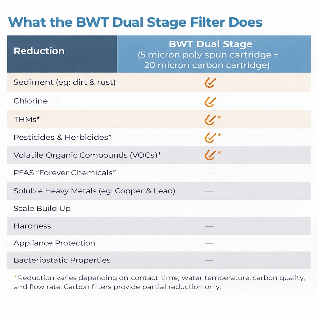 Our filters are designed to give you cleaner, fresher water throughout your entire home. The BWT Twin 20" Jumbo Housing System uses a powerful two-stage setup: a 5-micron pleated sediment filter to capture dirt, rust, and debris, followed by a 10-micron pleated carbon filter that helps reduce odours, improve taste, and remove organic compounds from your water. It’s ideal for whole-house use, perfect for showers, laundry, toilets, and garden taps, with high flow rates and washable filters that are built to last.