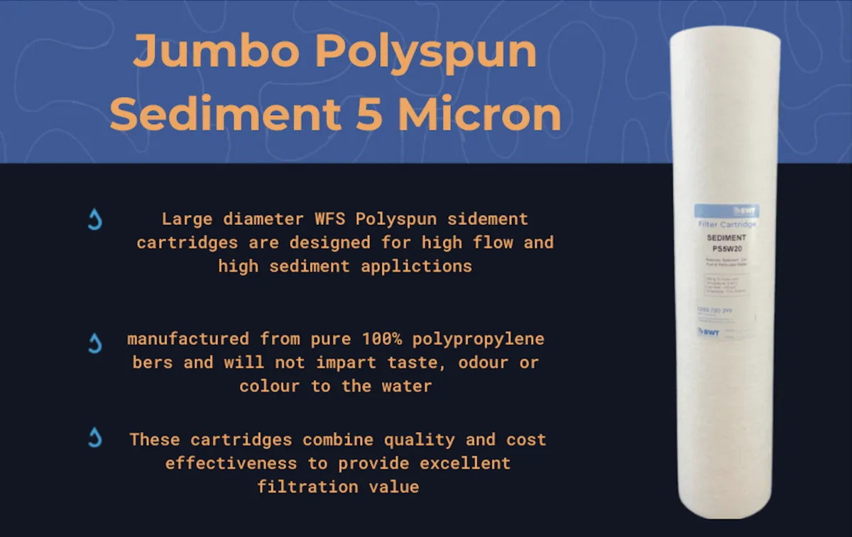 Our two stage filters include a 20" Jumbo Fibron Carbon 5 Micron filter to remove chlorine, offensive taste and odours combined with superior capacity sediment removal and a 20" Jumbo Polyspun Sediment 5 Micron filter that remove sediment and are designed to maintain high flow rates while dealing with high sediment loads. Three stage filters include a third filter that reduces the hardness of water removing scale. Softener cartridges will remove about 80% of the minerals that cause hard water
